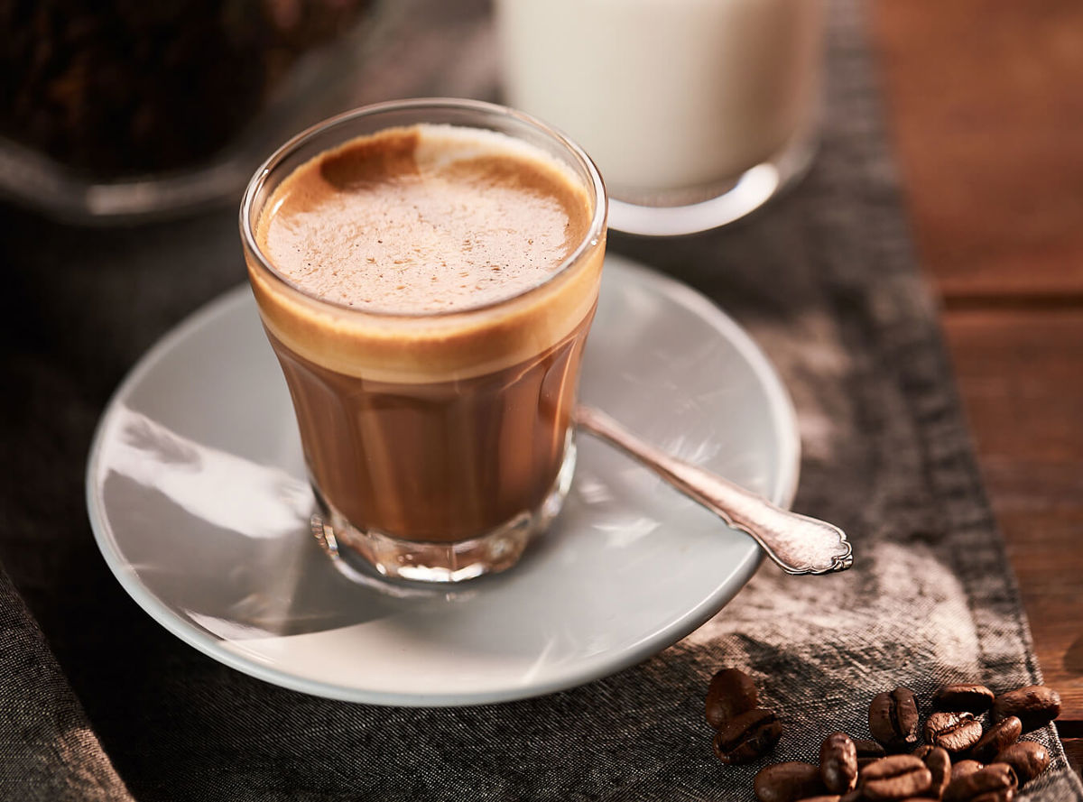 With a double shot of hot espresso and equal parts steamed milk, a cortado is the perfect cup if you like your coffee strong. The warm milk creates a perfect balance and reduces the acidity of the coffee – it may be small and simple but has a great kick to the taste.