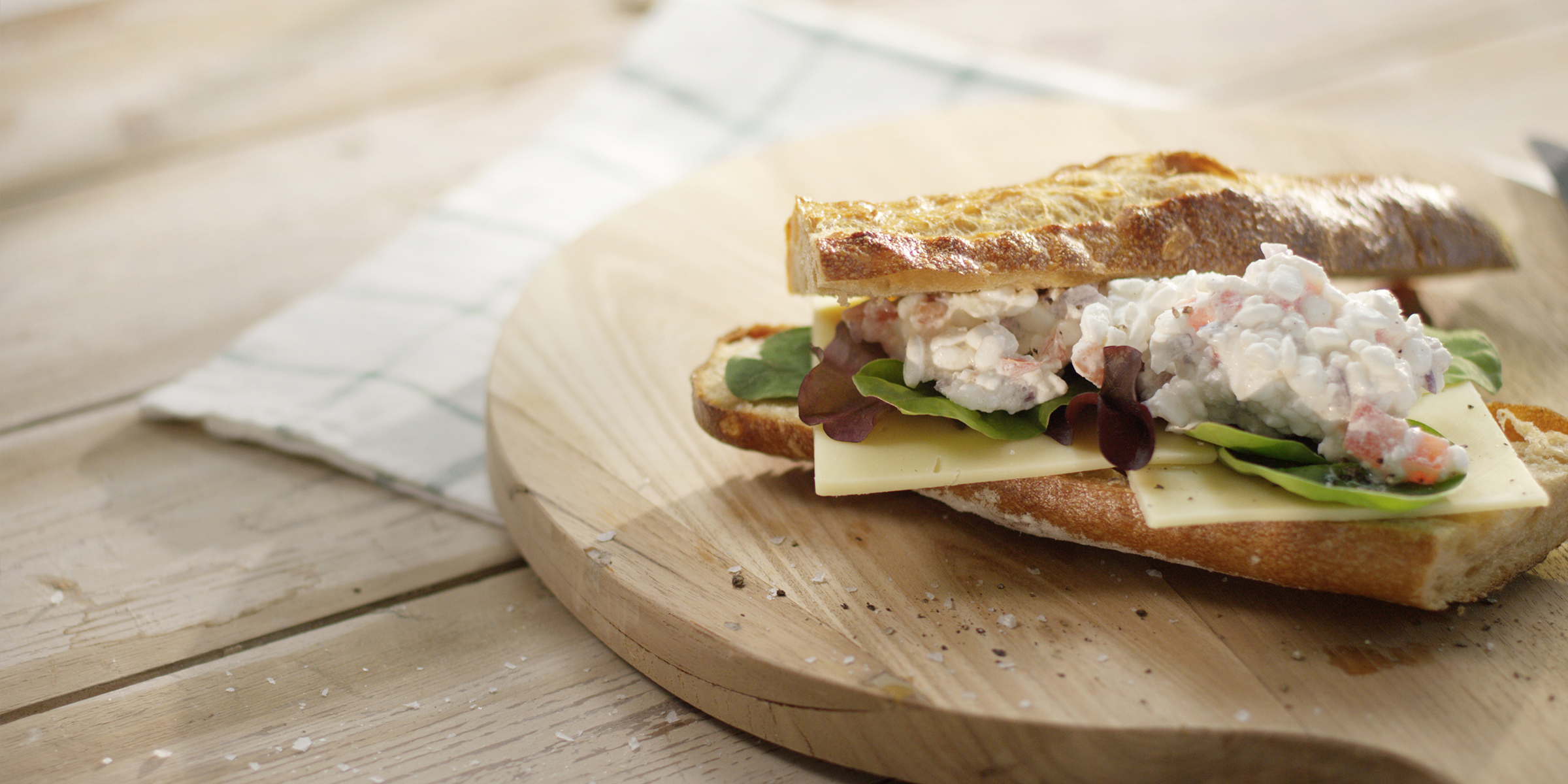 - Add Arla® Gouda and mixed salad leaves to baguette and top with cottage cheese salad.