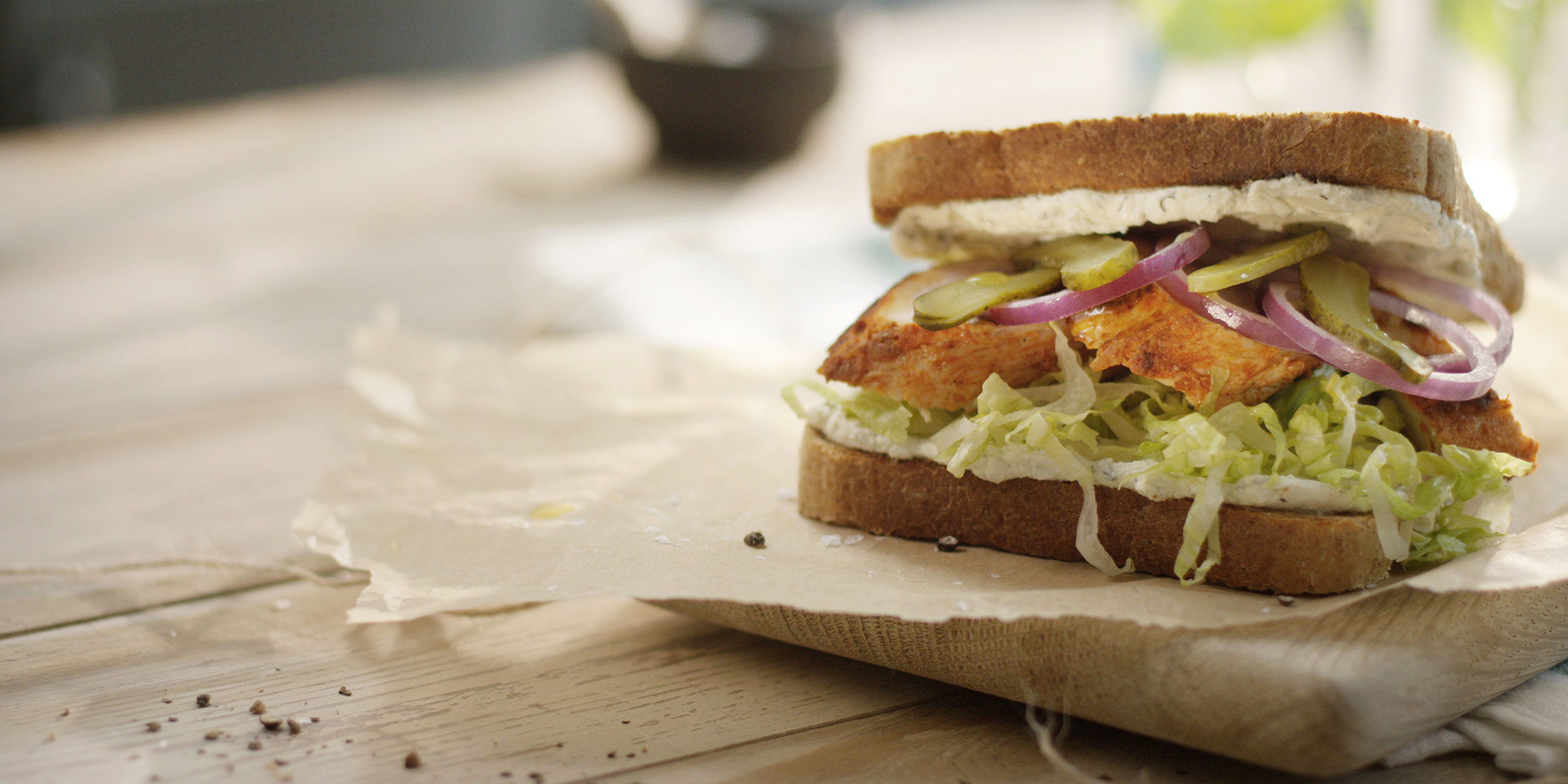 - Add slices of paprika chicken, romaine lettuce and slices of red onion and cornichons
