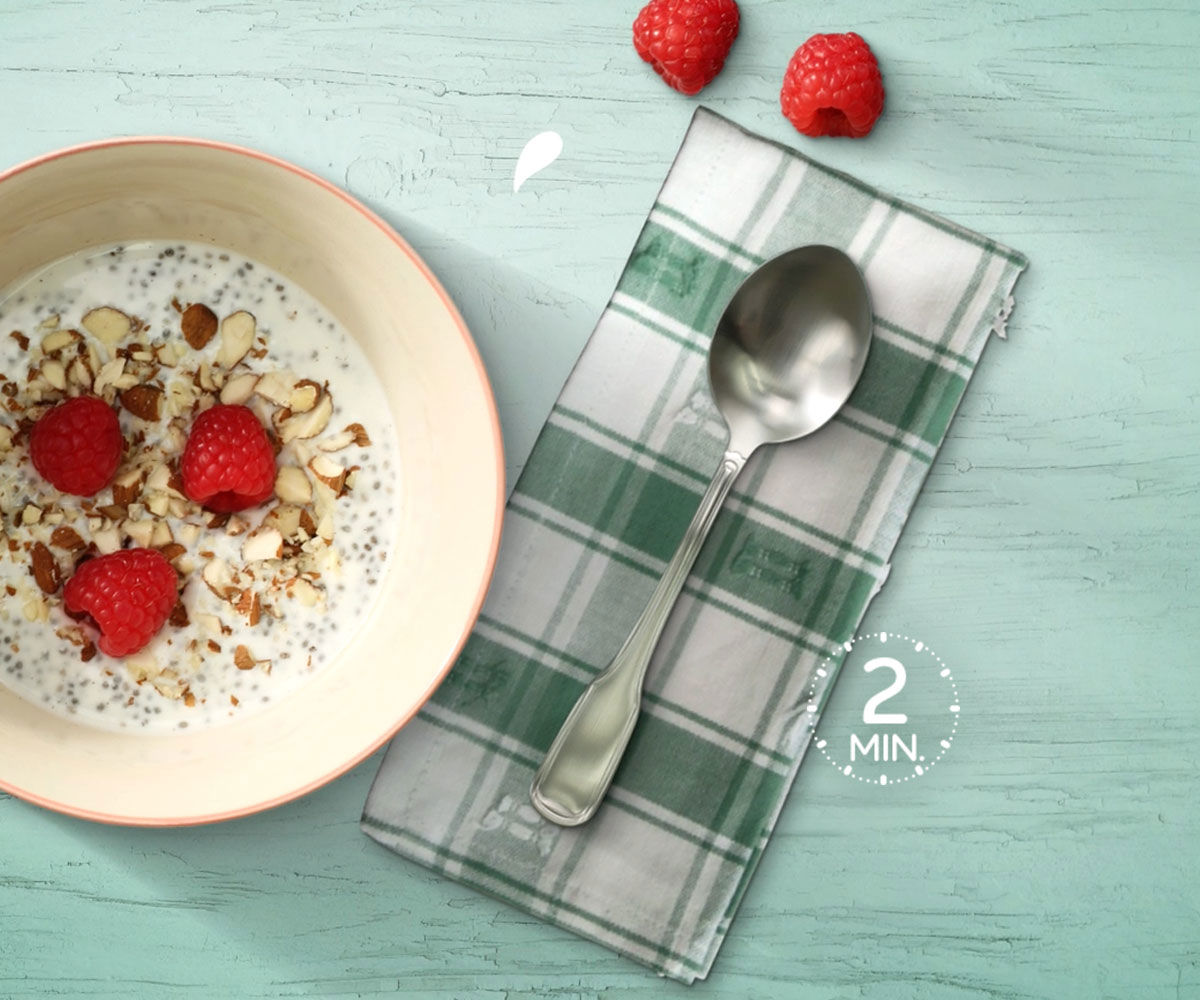 Mix all ingredients together in a bowl with a lid and place the porridge in the refrigerator overnight. Top your chia pudding with almonds and berries and enjoy the delicious breakfast right away. You can benefit from making a large portion, then you have breakfast for several days.