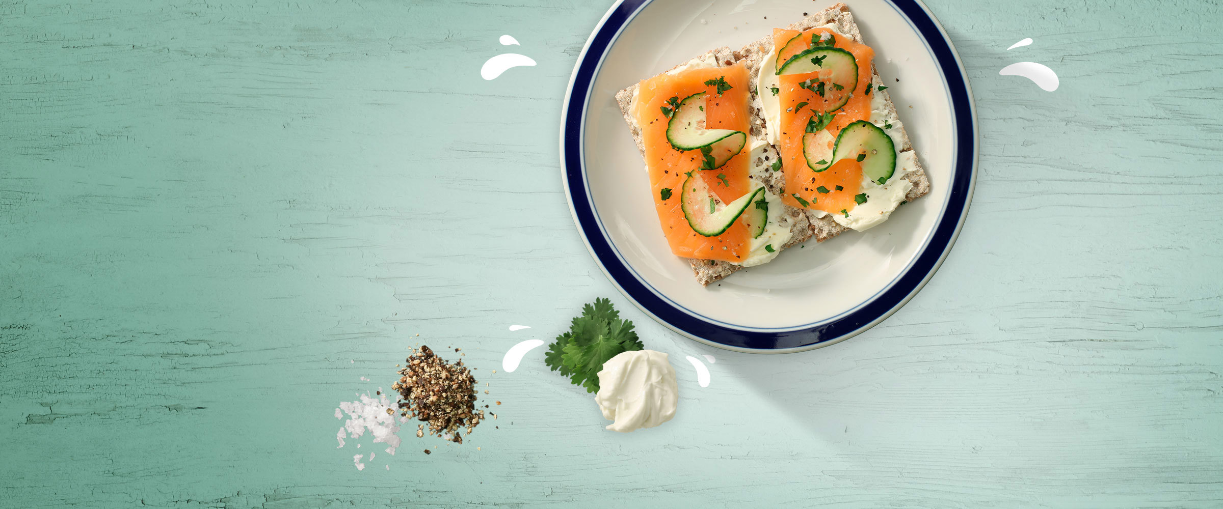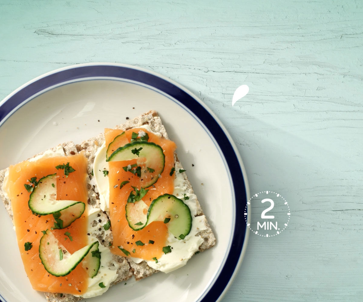 Butter the cripsbread with cream cheese and place the salmon on top of the cream cheese. Top it with fresh cucumber, coriander, salt and pepper.