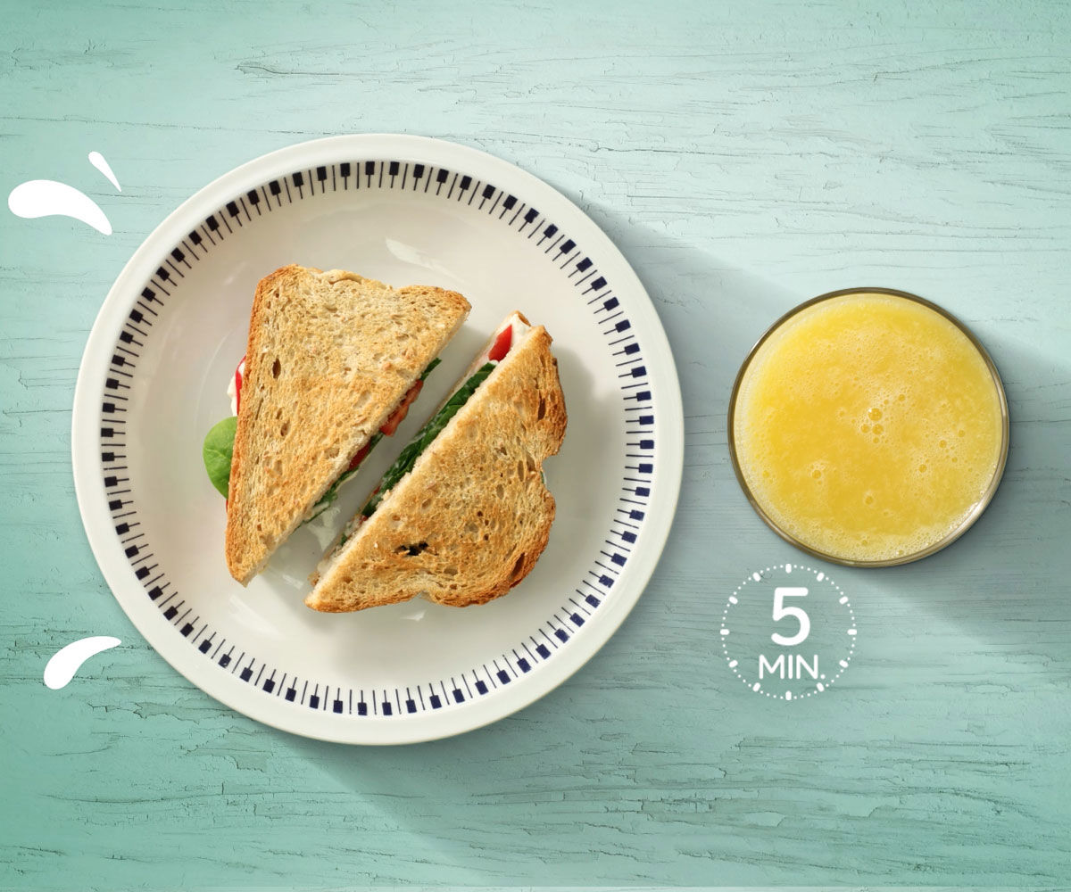 Build the sandwich and toast it in a toaster. Or eat it fresh, with only the bread toasted. Enjoy the sandwich with a glass of milk.