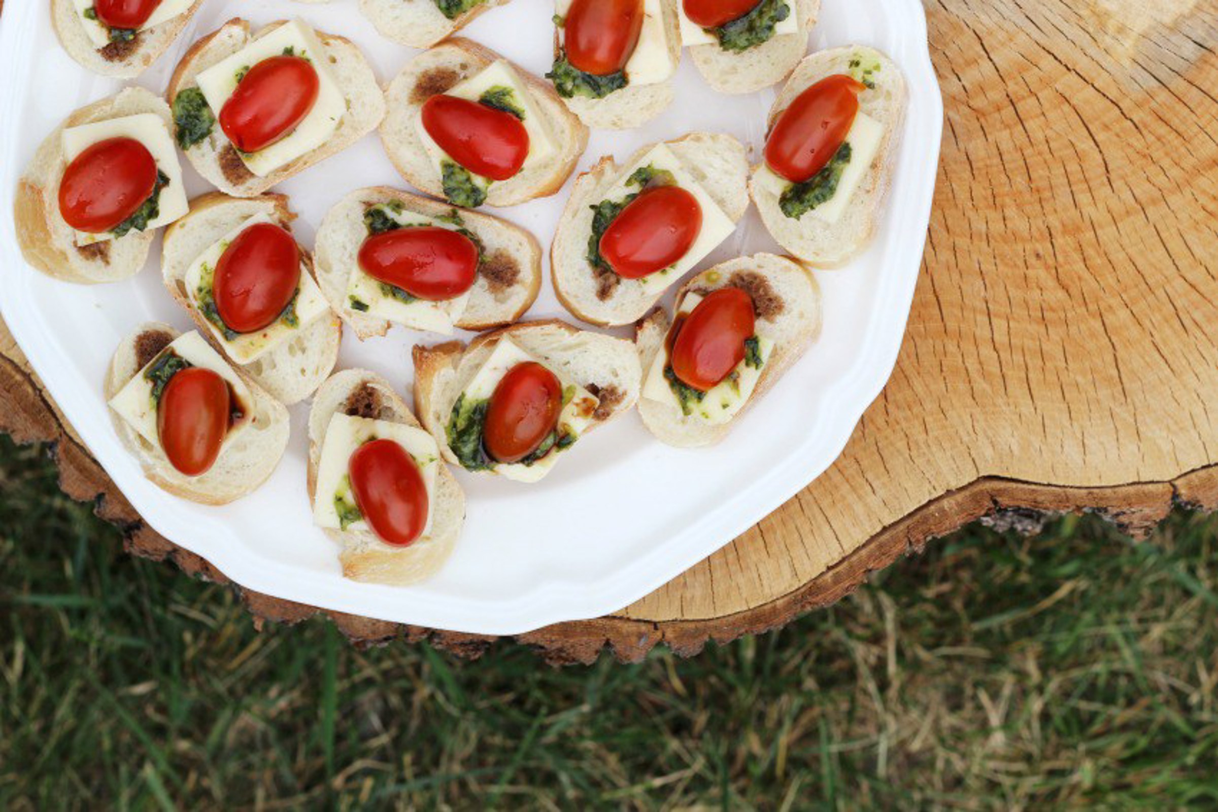 Trancher une baguette (ordinaire ou sans gluten) en section de 1 po d'épaisseur. Déposer sur une assiette de service. Trancher le Havarti Arla au jalapeño ou le Havarti Arla aux herbes et épices, et déposer les tranches sur le pain. Déposer une petite quantité de pâte de basilic sur le fromage et garnir d'une moitié de tomate cerise ou raisin. Arroser chaque bouchée d'un filet (1/4 c. à thé) d'huile d'olive et de vinaigre balsamique.