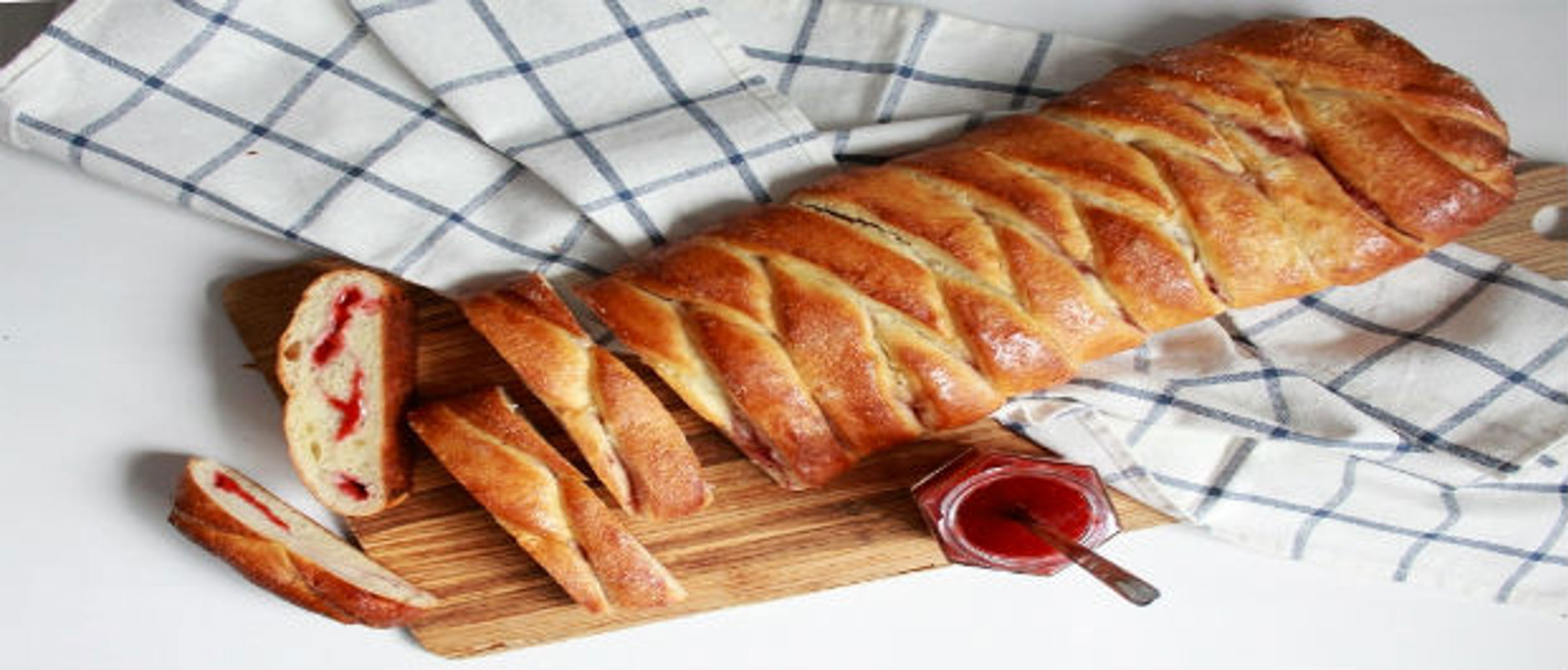 Couper des bandes de 1" sur toute la longueur de chaque côté de la pâte (les sections non recouvertes de garniture), du bord de la garniture jusqu'au bord extérieur de la pâte. Tresser le pain en commençant par les bandes de chaque coin supérieur, les superposant sur la garniture et les croisant une par-dessus l'autre. Continuer pour faire la tresse. Insérer la dernière tresse sous le pain.