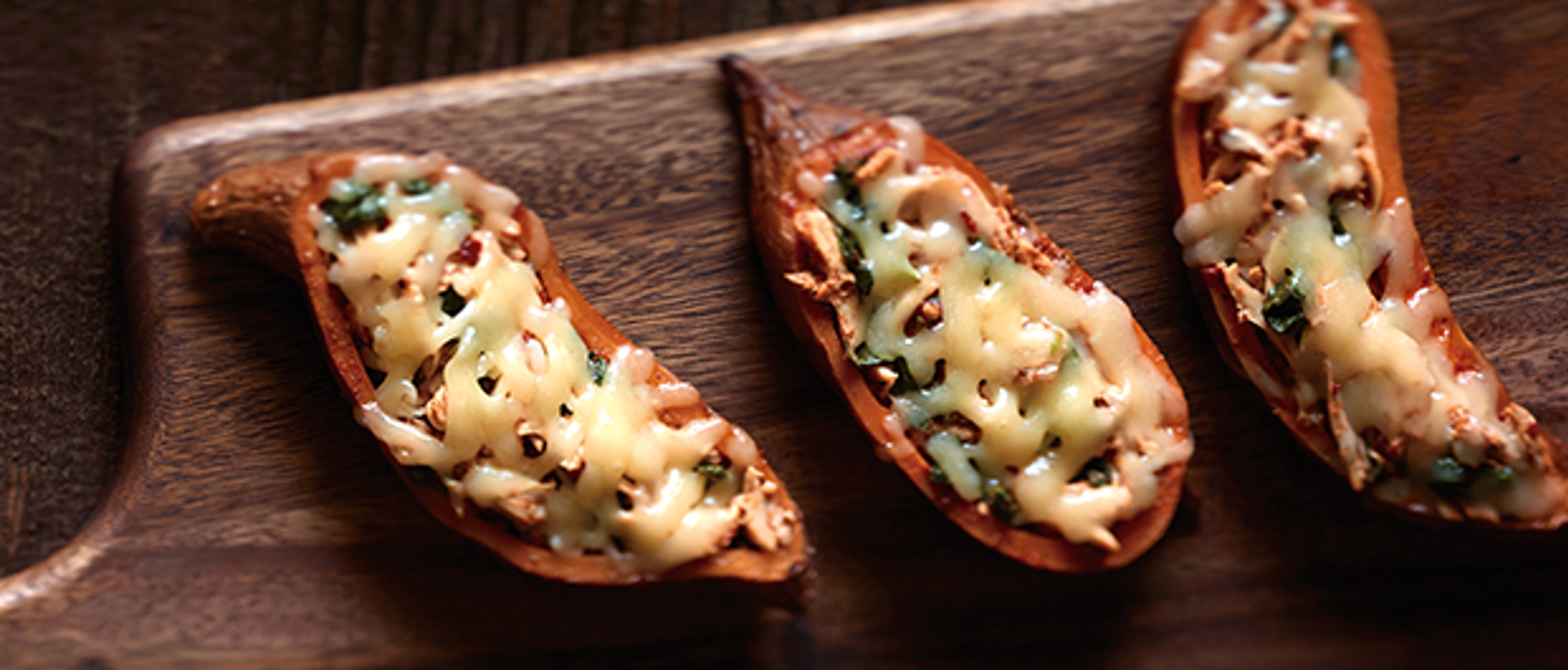 Retirer les pelures de patate douce du four et remplir avec le mélange de poulet et épinards. Recouvrir uniformément de fromage râpé. Retourner au four et cuire jusqu'à ce que le fromage fonde, environ 10 minutes.
