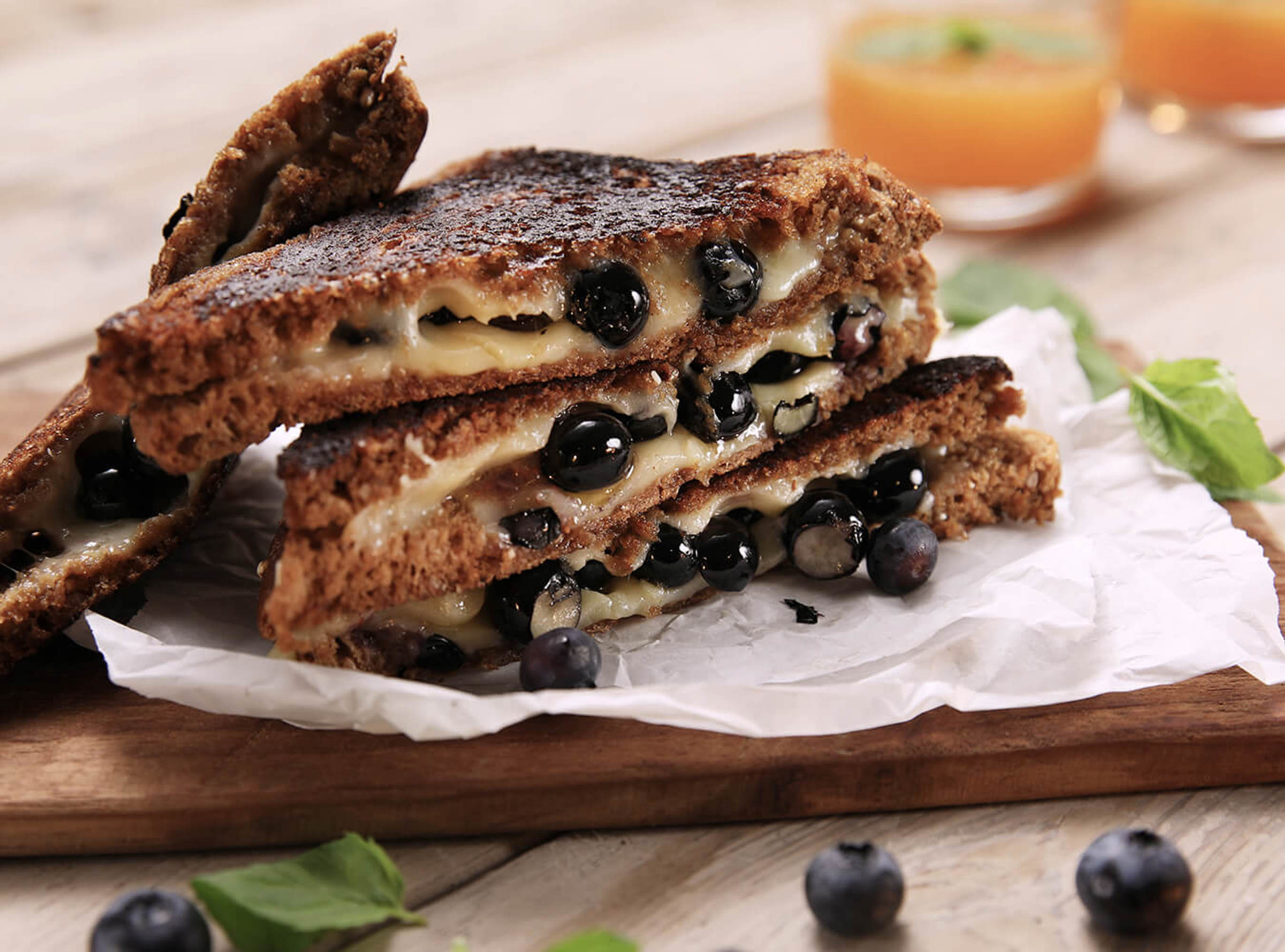 - Placer une tranche de pain sur la presse à panini et y déposer une tranche de Havarti crémeux Arla. Ajouter des bleuets sur le fromage. Garnir d'une autre tranche de Havarti crémeux. Placer une deuxième tranche de pain sur le dessus et fermer le couvercle de la presse à panini.