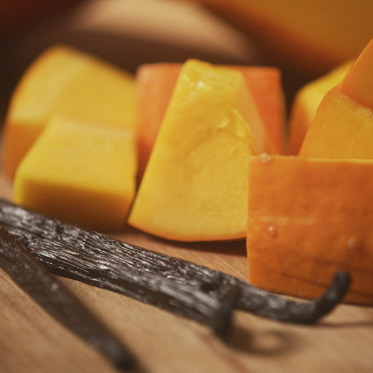 To make the filling split the vanilla pod lengthwise and scrape out the seeds. Mix the vanilla seeds with 2 tbsp. caster sugar to separate the seeds. Whisk Arla Natural Cream Cheese soft and mix in vanilla seeds and sugar. Add lemon zest and juice and mix. In a separate bowl, mix pumpkin puree with eggs and egg yolks. Gently mix the pumpkin with the cream cheese blend and pour onto the biscuit base. Use a spatula to spread into an even layer. Wrap the outside of the cake tin in a double layer of tinfoil to cover the base and extend the tinfoil all the way to top of the cake tin. Place the tinfoil-wrapped tin in a large roasting pan and pour hot water into roasting pan. Make sure the water is no higher than halfway up the sides of the cake tin. Bake the cheesecake for approx. 50 minutes at 160°C. The outer ring of the cheesecake should be firm but the inner circle like pudding. Let the cake cool for 10 minutes and prepare the topping